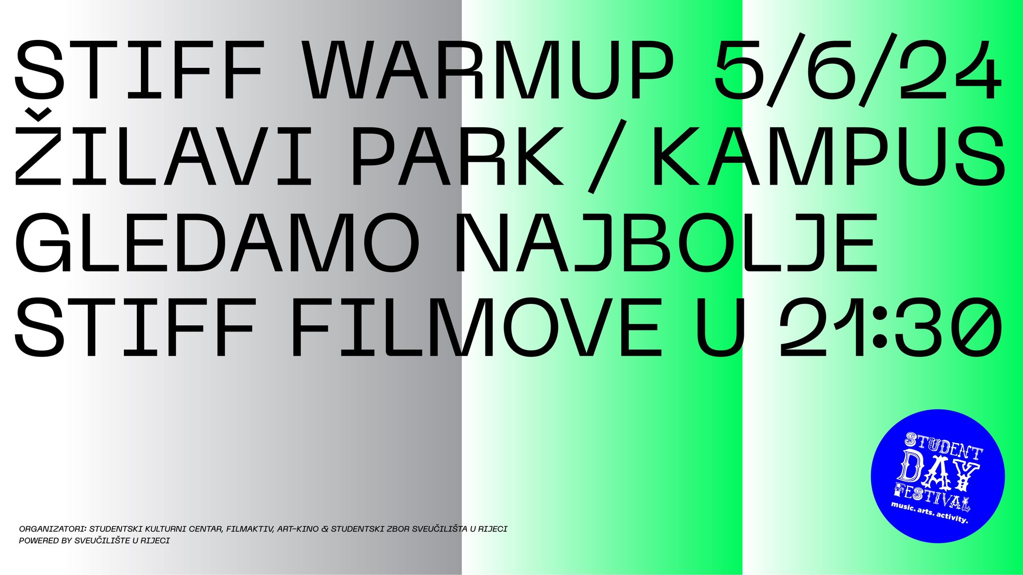 Ovogodišnji Student Day Festival donosi nešto stvarno novo – nešto neviđeno – u sklopu warmupa za SDF! U srijedu, 5.6. u 21:30 Žilavi park (novootvoreno košarkaško igralište) u suradnji s Art-kinom pretvaramo u kino pod zvijezdama i ispunjavamo nagrađenim studentskim filmovima.